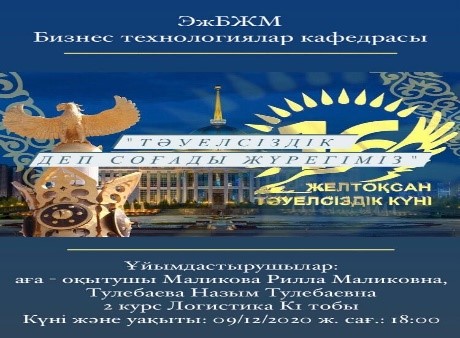 В рамках проекта "Рухани жаңғыру!" старший преподаватель кафедры «Бизнес-технологии» Высшей школы экономики и бизнеса Казахского национального университета имени аль-Фараби Маликова Р.М., преподаватель Тулебаева Н.Т. и студенты 2 курса специальности «Логистика» (группа ЛГ19К1) 09.12.2020 в честь Дня Независимости Республики Казахстан провели социально-воспитательное онлайн мероприятие «Тәуелсіздік деп соғады жүрегіміз».