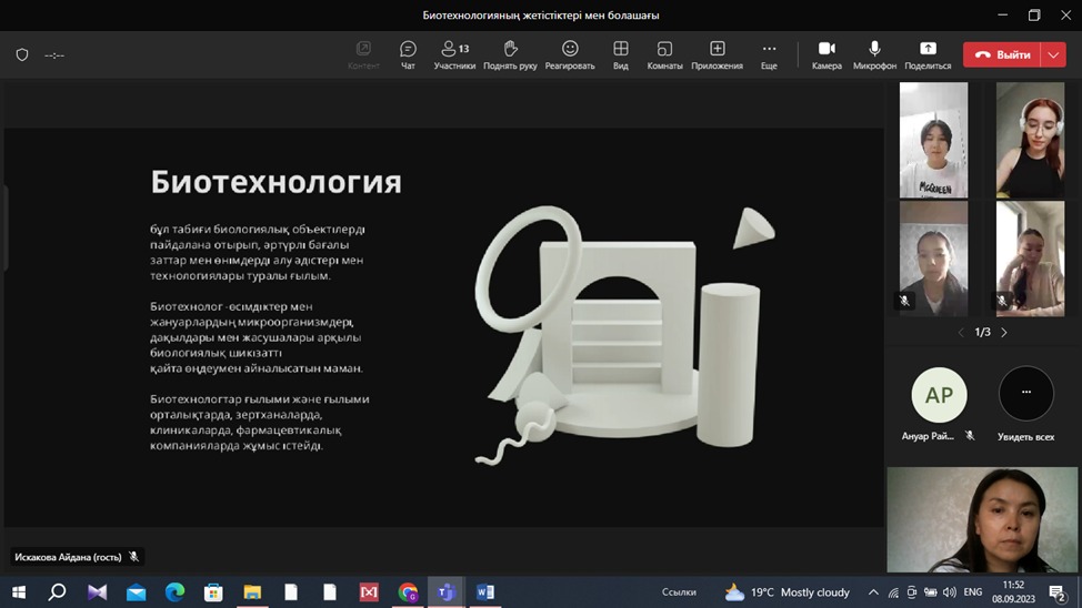 11.10.202311.10.2023 г. на кафедре Биотехнологии под руководством профессора Атабаевой С.Д., к.б.н. Мухатаевой К.А., Ултанбековой Г.Д., к.б.н. и студентами специальности Биотехнология, в рамках Цели устойчивого развития ОНН: 2 Ликвидация голода, было организовано мероприятие на тему: «Спасут ли ГМО мир от голода?». В целом по этому направлению рассматриваются и решаются вопросы обеспечения продовольственной безопасности и улучшение питания, а также содействия устойчивому развитию сельского хозяйства.