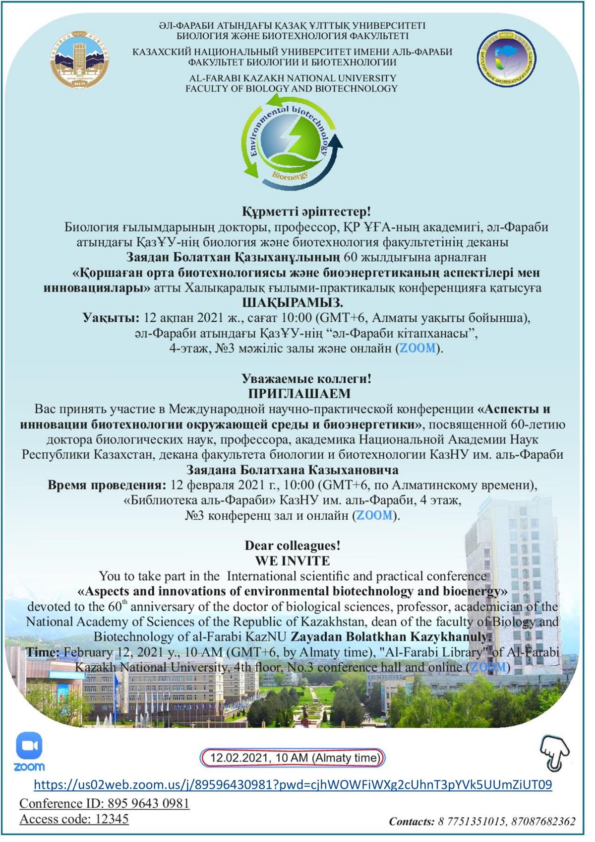 посвященной 60-летию доктора биологических наук, профессора, академика Национальной Академии Наук Республики Казахстан, декана факультета биологии и биотехнологии КазНУ им. аль-Фараби Заядана Болатхана Казыхановича