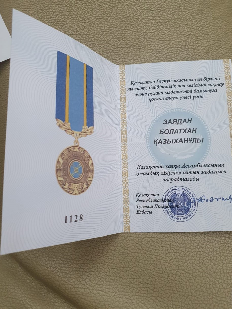 Декан факультета биологии и биотехнологии, профессор кафедры биотехнологии, академик НАН РК Заядан Болатхан Казыханович награжден золотой медалью Ассамблеи народа Казахстана "Бірлік" за вклад в укрепление единства. Республики Казахстан, мира, согласия, и развития науки.