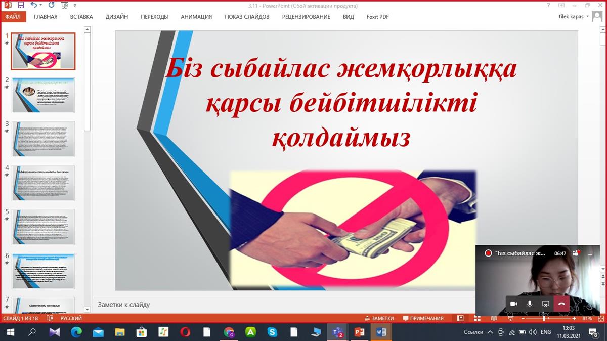 28.03.2021Студентам 1 курса НИШ был показан слайд на тему «Мы поддерживаем мир против коррупции», в конце которого студенты высказали свое мнение по теме и выразили свое несогласие с коррупцией. Эдвайзер: Доктырбай Г.