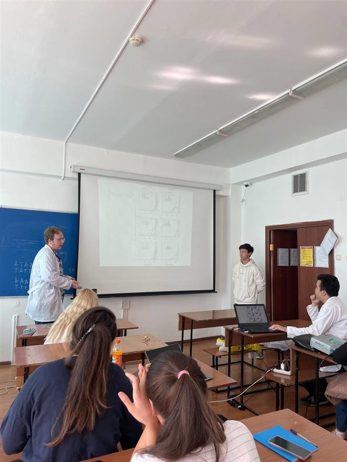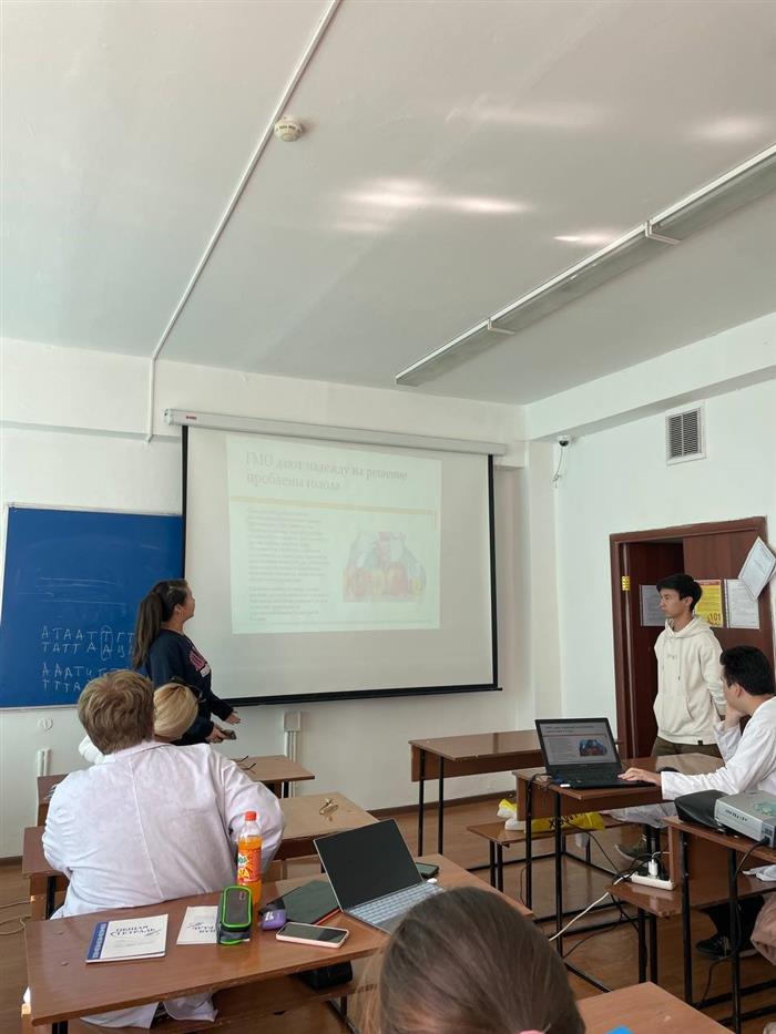 11.10.2023 г. на кафедре Биотехнологии под руководством профессора Атабаевой С.Д., к.б.н. Мухатаевой К.А., Ултанбековой Г.Д., к.б.н. и студентами специальности Биотехнология, в рамках Цели устойчивого развития ОНН: 2 Ликвидация голода, было организовано мероприятие на тему: «Спасут ли ГМО мир от голода?». В целом по этому направлению рассматриваются и решаются вопросы обеспечения продовольственной безопасности и улучшение питания, а также содействия устойчивому развитию сельского хозяйства.