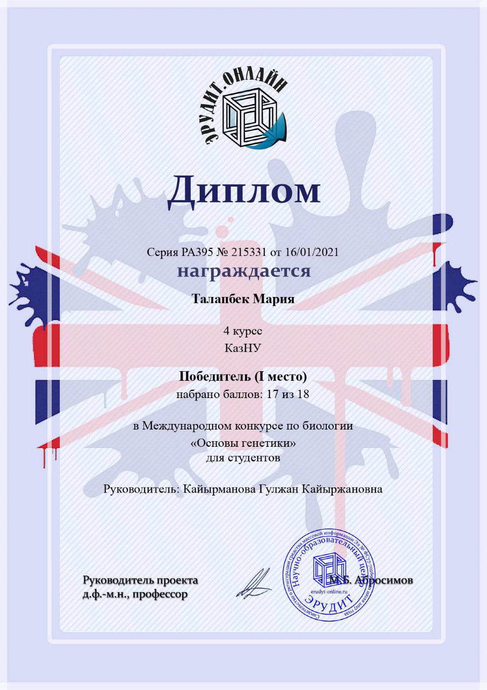Талапбек Мария , студентка 4 курса специальности "Биотехнология“ – награждена Дипломом 1 степени Серии (РА395 №215331) Международной олимпиады по биологии «Основы генетики» среди студентов, 27.01.2021 г. - научный руководитель Кайырманова Г. К. 04.02.2021 Подробнее >>