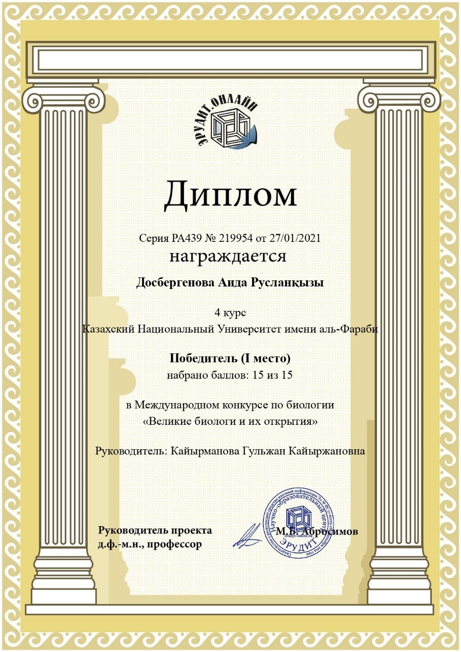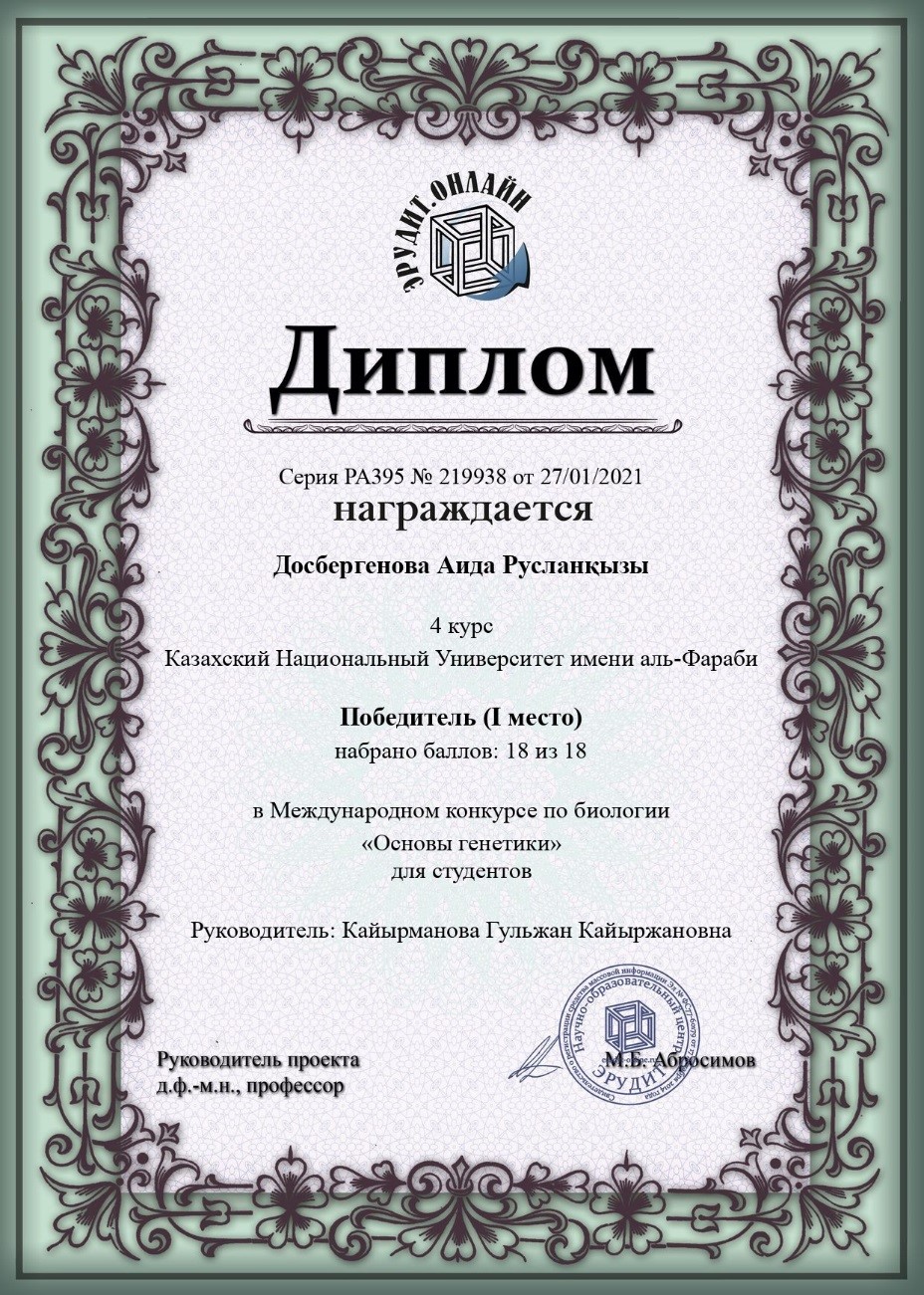 Досбергенова Аида Русланқызы, студентка 4 курса специальности "Биотехнология“ – награждена Дипломом 1 степени (РА395 №219938) Международной олимпиады по биологии среди студентов, 27.01.2021 г. - научный руководитель Кайырманова Г. К. 04.02.2021 Подробнее >>