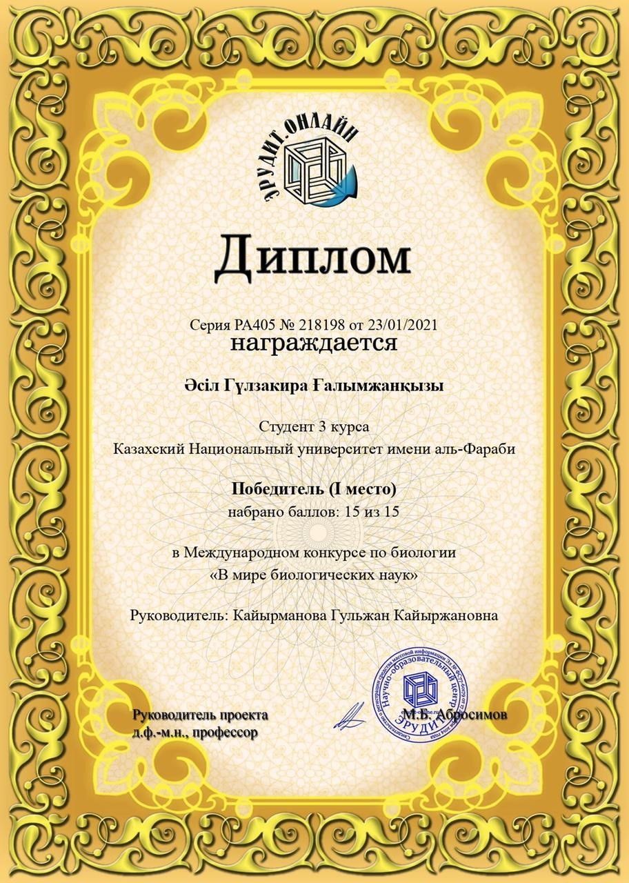 Асил Гулзакира, студентка 3 курса специальности "Биотехнология“ – награждена Дипломом 1 степени (РА405 № 218198) Международной олимпиады по биологии среди студентов, 27.01.2021 г. - научный руководитель Кайырманова Г. К. 04.02.2021 Подробнее >>
