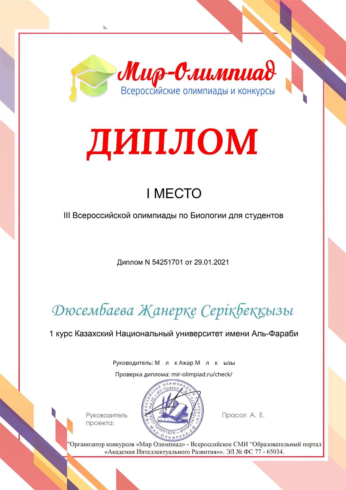 Дюсембаева Жанерке. Студентка 1-курса специальности «Биотехнология» награждена Дипломом ( 1 место, № ФС 77 - 65034) Всероссийской олимпиадыпо направлению «Биология», куратор-эдвайзер Мәлік Ажар Мәлікқызы. 05.02.2021 Подробнее >>