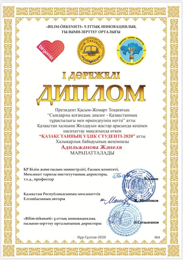 Адильжанова Жанеля. В целях популяризации Послания Президента Касым-Жомарта Токаева «Критический общественный диалог - залог стабильности и процветания Казахстана» среди молодежи награжден дипломом I степени на Международном конкурсе «ЛУЧШИЙ СТУДЕНТ КАЗАХСТАНА 2020». и его вклад 07.02.2021 Подробнее >>