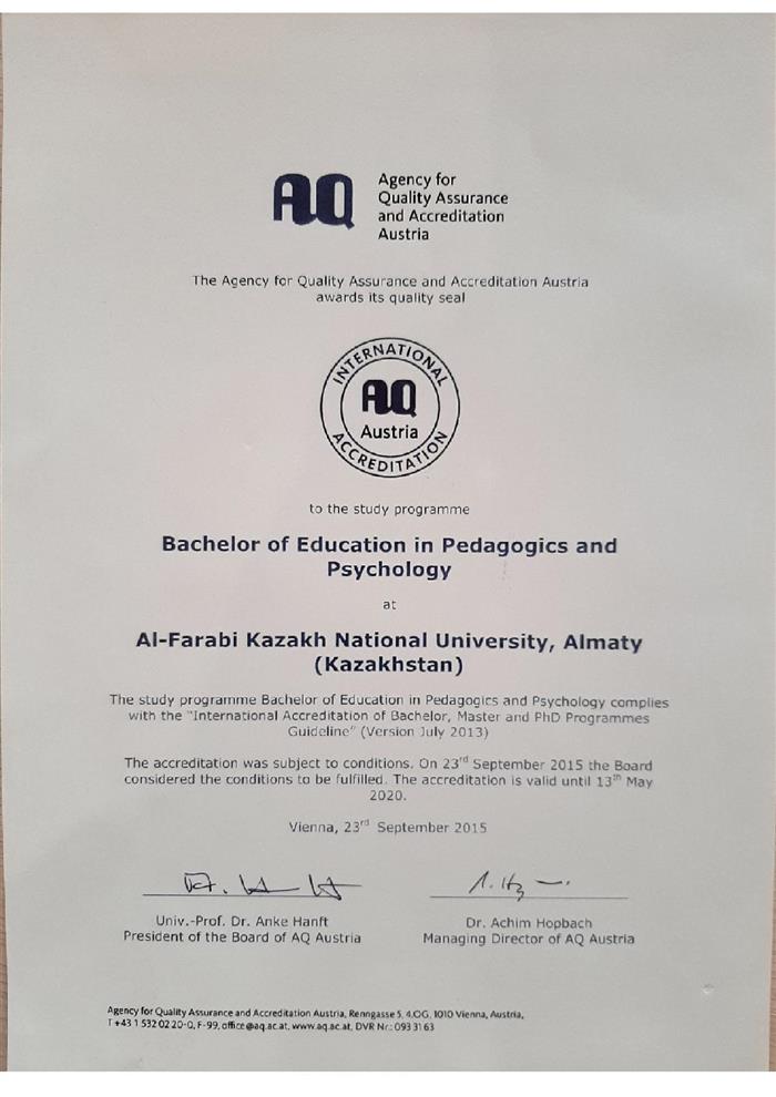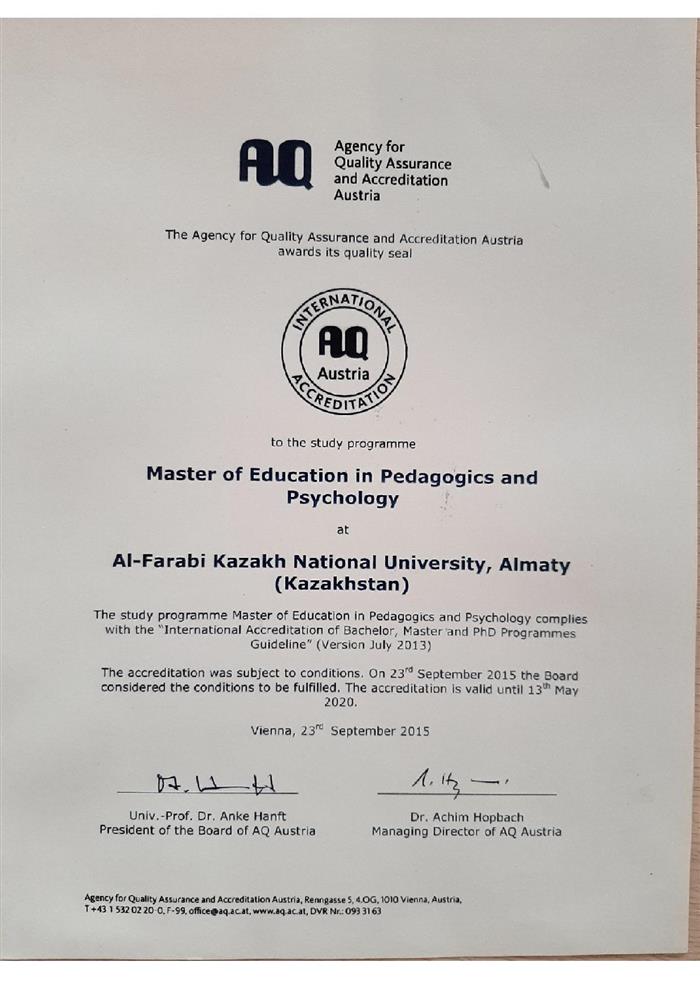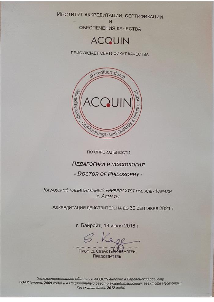 - Кафедра педагогики и образовательного менеджмента прошла международную аккредитацию(ACQUIN) по специальности "Педагогика и психология(PhD докторантура/Doctor of Philosophy)".