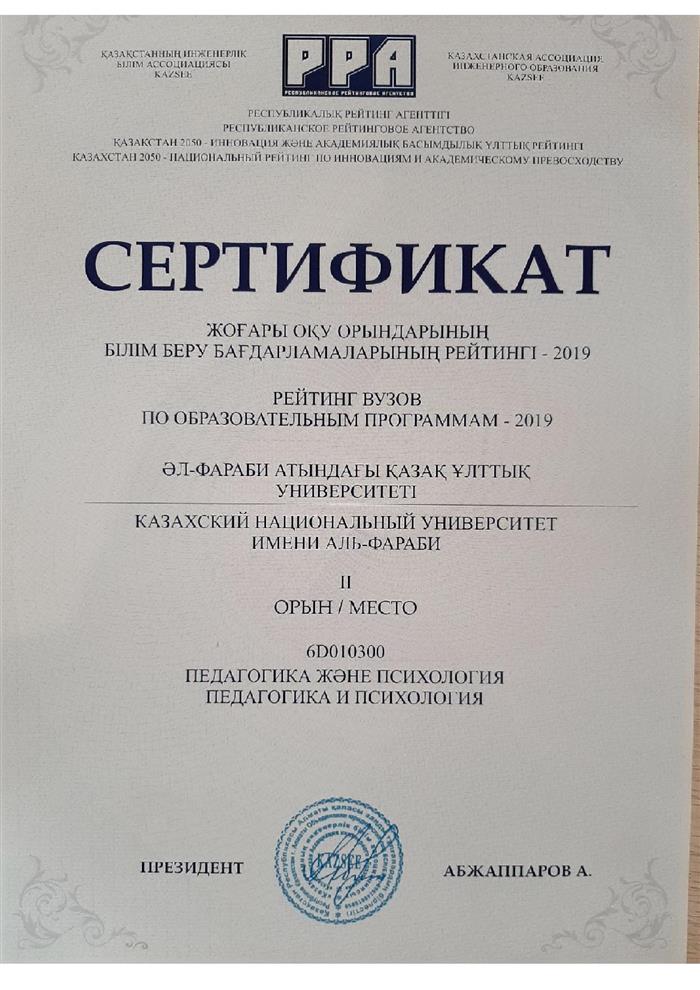 - Кафедра педагогики и и образовательного менеджмента заняла второе место по образовательной программе «6D010300 - Педагогика и психология (PhD)» в рейтинге образовательных программ высшего образования (РРА).