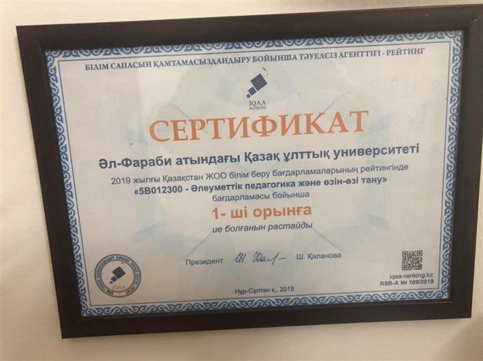 - Кафедра педагогики и образовательного менеджмента в рейтинге образовательных программ вузов Казахстана-2019(IQAA) по программе "5B012300 - Cоциальная педагогика и самопознание(бакалавр)" заняла первое место.