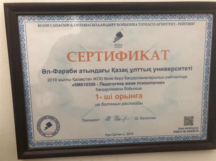 - Кафедра педагогики и образовательного менеджмента в рейтинге образовательных программ вузов Казахстана-2019(IQAA) по программе "6M010300 - Педагогика и психология(магистратура)" заняла первое место.