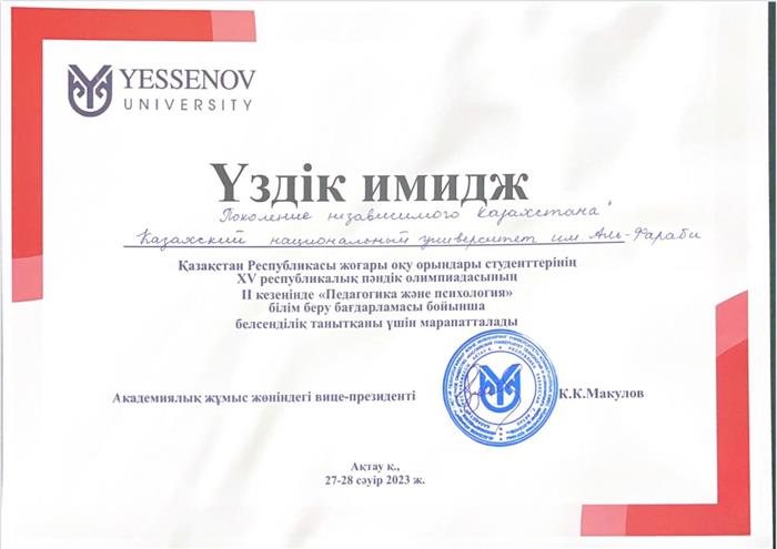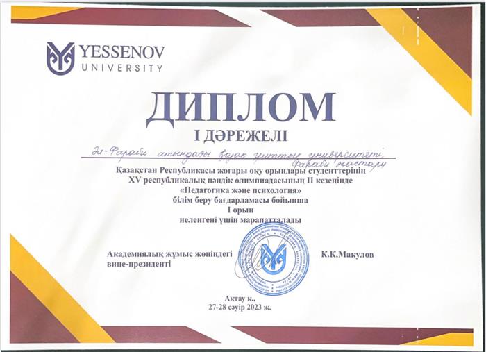 С 27 по 28 апреля текущего года в Каспийском университете технологий и инжиниринга имени Ш. Есенова (Yessenov university) на XV республиканской предметной олимпиаде студенты КазНУ им.Аль-Фараби образовательной программы “ Педагогика и Психология” команда "Фараби жастары" заняли 1 место. Второй команде "Тәуелсіз Қазақстан ұрпақ" была присуждена номинация "Лучший имидж". Две команды и руководители С. А. Рамазанова, Г. А. Қырғызхан, а также коллектив кафедры педагогики и образовательного менеджмента поздравляем наших студентов с победами!!! Желаем успехов университету имени Есенова!!!