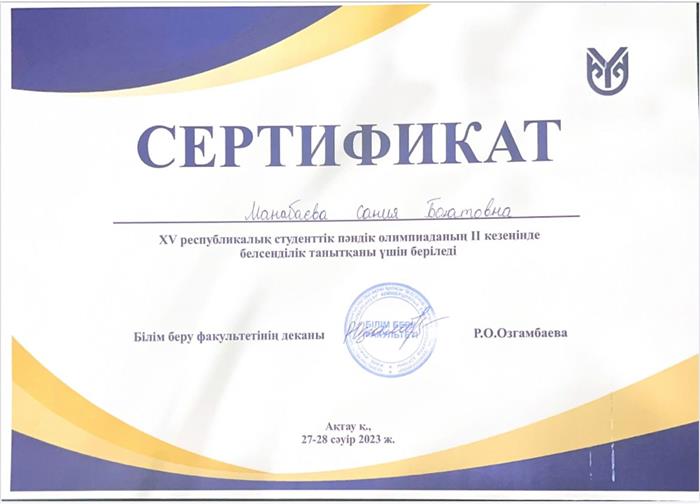 НА XV РЕСПУБЛИКАНСКОЙ ПРЕДМЕТНОЙ ОЛИМПИАДЕ СТУДЕНТ МАНАБАЕВА САНИЯ КАЗНУ ИМ.АЛЬ-ФАРАБИ ОБРАЗОВАТЕЛЬНОЙ ПРОГРАММЫ “ ПЕДАГОГИКА И ПСИХОЛОГИЯ” НАГРАЖДАЕТСЯ ЗА АКТИВНОСТЬ .