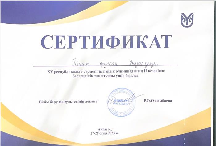 НА XV РЕСПУБЛИКАНСКОЙ ПРЕДМЕТНОЙ ОЛИМПИАДЕ СТУДЕНТ РАШИД АРУЖАН КАЗНУ ИМ.АЛЬ-ФАРАБИ ОБРАЗОВАТЕЛЬНОЙ ПРОГРАММЫ “ ПЕДАГОГИКА И ПСИХОЛОГИЯ” НАГРАЖДАЕТСЯ ЗА АКТИВНОСТЬ .