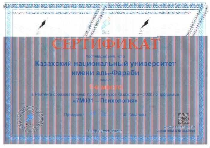 Казахский национальный университет имени аль-Фараби занял 1 место в рейтинге образовательных программ вузов Казахстана – 2020 по программе 7М031-Психология.