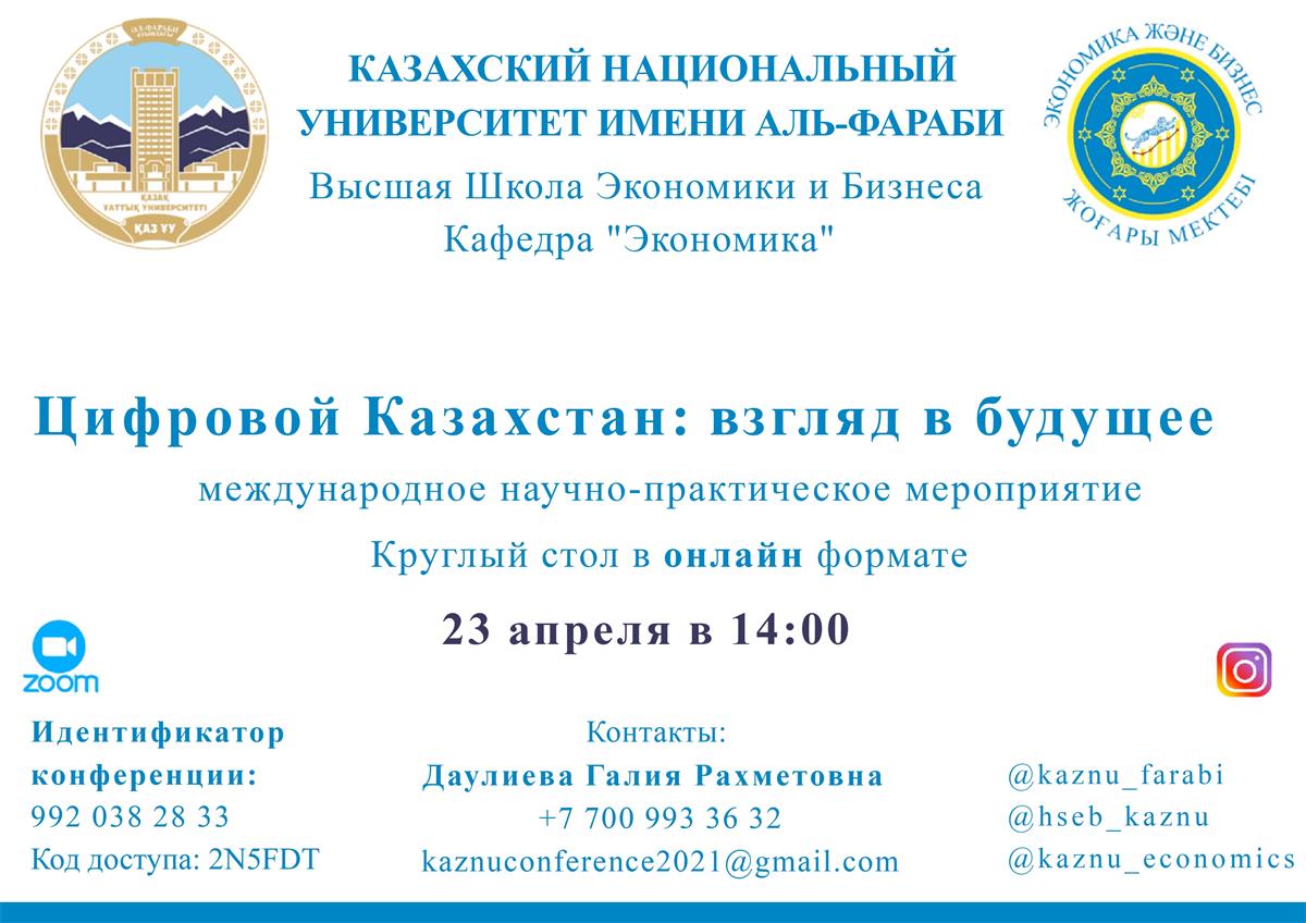 20.04.202123 апреля 2021 года кафедра «Экономика» ВШЭиБ проведет международное научно-практическое мероприятие в формате круглого стола на тему “Цифровой Казахстан: взгляд в будущее”, посвященное к 30 летию Независимости Республики Казахстан.
