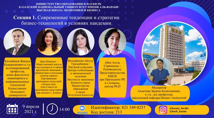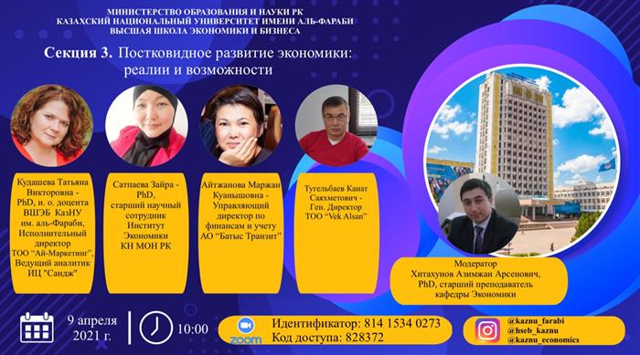 8-9 апреля 2021 года Высшая школа экономики и бизнеса Казахского национального университета имени аль-Фараби проведет Международную научно-практическую конференцию на тему: «Влияние пандемии на достижение целей устойчивого развития: тенденции и эффекты».