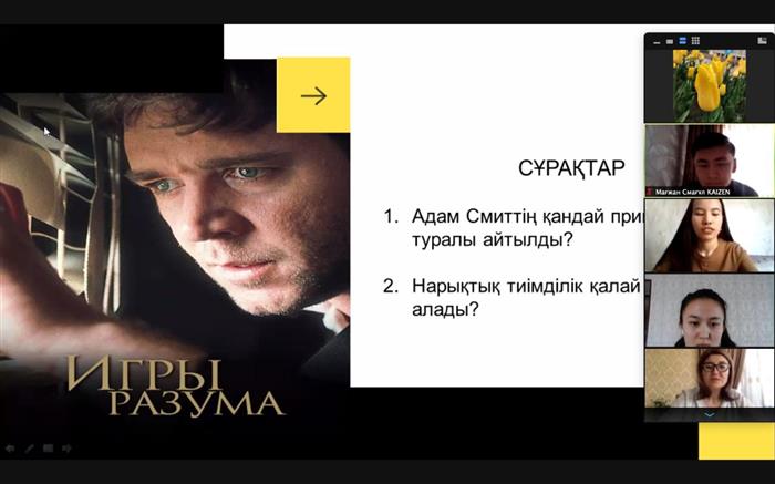 К 30-летию Независимости Республики Казахстан была проведена республиканская интеллектуальная игра “Smart student” среди студентов высших учебных заведений, организованная кафедрой “Экономика” Высшей школы экономики и бизнеса. Во 2 тур игры прошли команда “Барыс” Атырауского государственного университета имени Х. Досмухамбетова, команда “KAIZEN” Западно-Казахстанского университета имени М. Утемисова, команда “Жетісу” Жетысуского государственного университета имени И. Жансугурова и команда “Экономикс22” Казахского национального университета имени аль-Фараби. По результатам интеллектуальной игры I место заняла команда “Барыс”, члены команды: Жұмахметова Айзада, Санахметова Әйгерім, Убенова Ару. ІІ-место поделили между собой две команды - команда “Экономикс22”, члены команды: Ідріс Рзагүл, Толқынова Бота, Саткен Райхан и команда “Жетісу”, члены команды: Жумаханова Наргиз, Сайлаубаев Бекарыс, Воронцова Диана. ІІІ место заняла команда "KAIZEN", члены команды: Смағұл Мағжан, Марксова Малика, Байғазы Алмира. Благодарим команды-участницы за активность и желаем дальнейших творческих успехов!