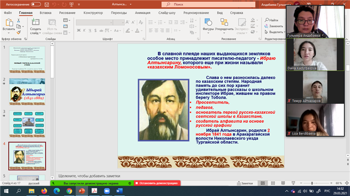 В рамках реализации проекта «Айналаңды нұрландыр», а также 30-летию независимости Республики Казахстан и 180-летию со дня рождения Ибрая Алтынсарина студенты 2 курса специальности Экономика и куратор Андабаева Г.К. провели кураторский час на тему «Первый учитель казахской степи». Ибрай Алтынсарин вошел в историю общественной мысли и литературы Казахстана как замечательный педагог-просветитель, писатель, фольклорист и этнограф.