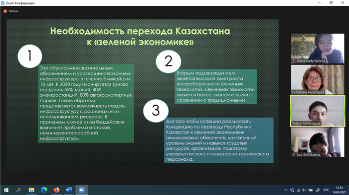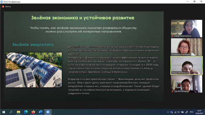 В рамках реализации проекта «Green Campus» студенты 2 курса специальности Экономика и куратор Андабаева Г.К. провели круглый стол на тему «Зеленая экономика как разновидность экономической модели». В основе зеленой экономики – чистые или «зеленые» технологии. По словам специалистов, развитие «зеленой» экономики позволит избежать нашей стране экологического кризиса, который затронул своими масштабами уже многие постиндустриальные страны.