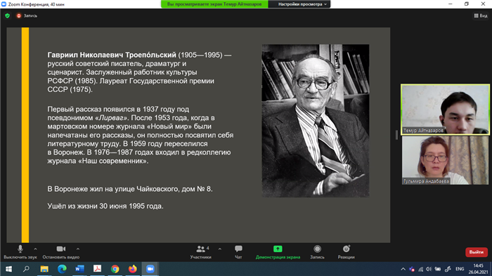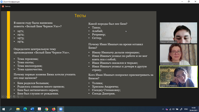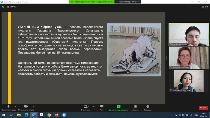 В рамках реализации проекта «100 книг» студенты 2 курса специальности Экономика и куратор Андабаева Г.К. провели кураторский час, посвященный произведению Г.Троепольского «Белый Бим Черное ухо».