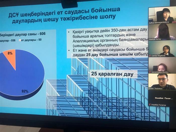 Большой интерес вызвало выступление приглашенного гостя – Генерального директора ТОО «Kazakh Holding» Базарбекова Д.К. Он поделился своим практическим опытом и отметил необходимость усовершенствования механизма поддержки и защиты отечественных предпринимателей, пострадавших в период пандемии COVID 2019 и продвижения интересов Казахстана как члена ВТО на международной арене.