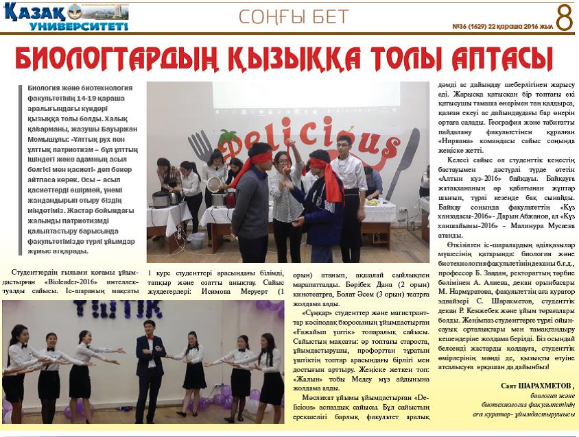 20.12.2020Саят Шарахметов ,биология және биотехнология факультетінің аға куратор- ұйымдастырушысы. Биологтардың қызыққа толы аптасы №36 (1629) 22 қараша2016 жыл, 8-бет