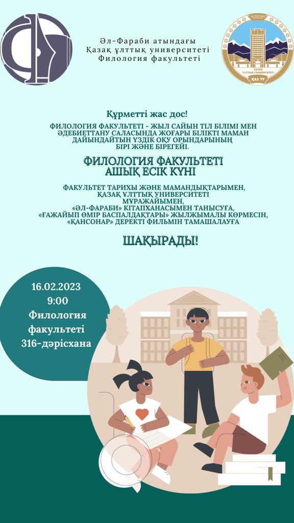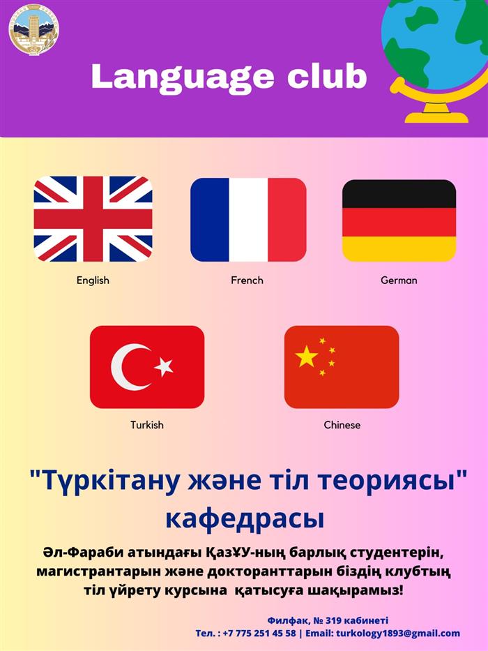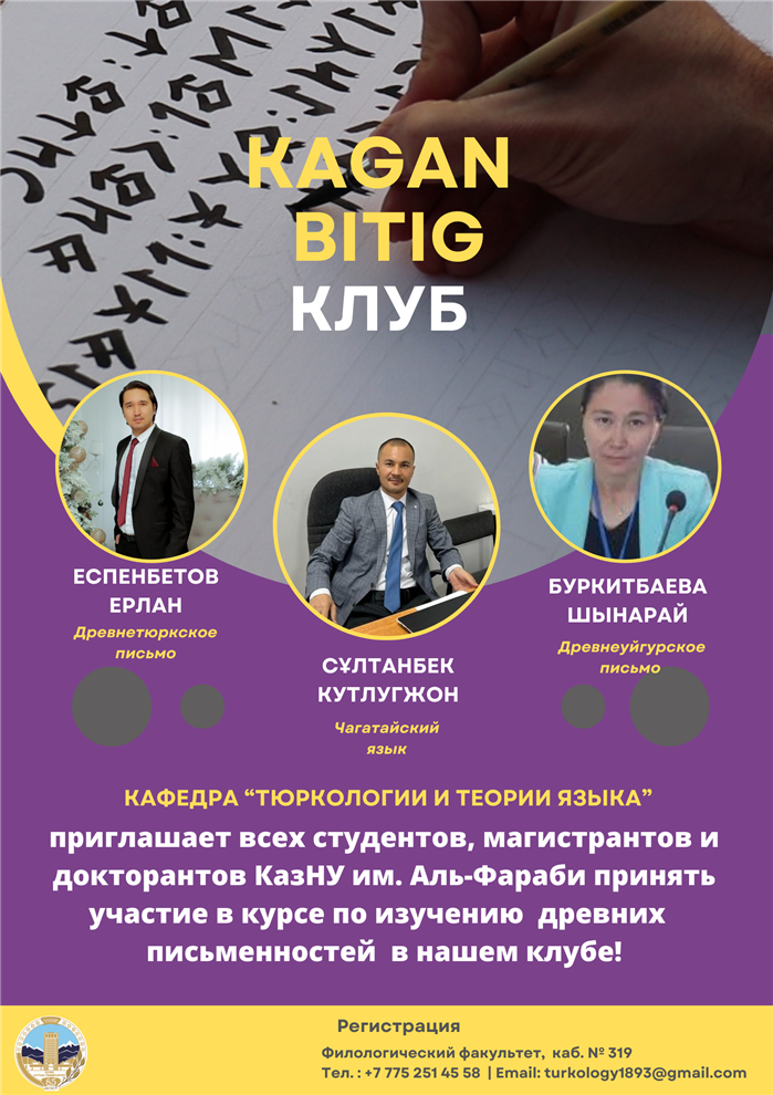 Уважаемые студенты, магистранты, докторанты и преподаватели КазНУ! Для всестороннего развития молодежного общества и страны в целом, кафедра "Тюркологии и теории языка" приглашает всех желающих в наш клуб Kagan Bitig: