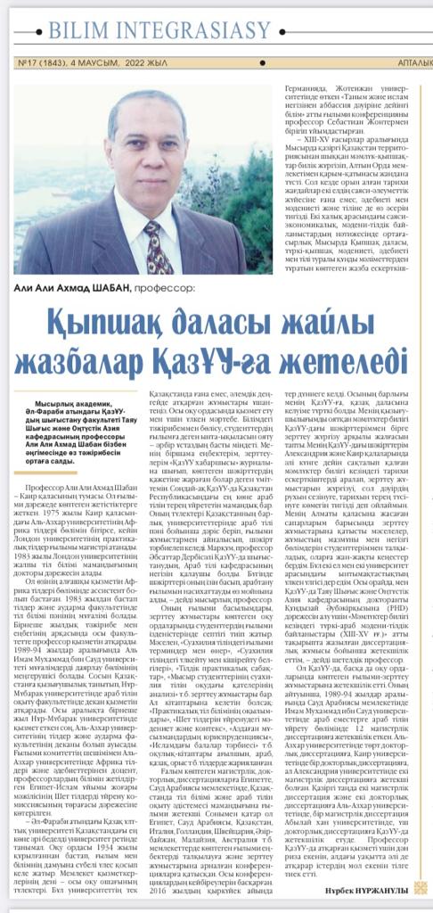 | 9 | Шабан А. | Қыпшақ даласы жайлы жазбалар ҚазҰУ-ға жетеледі | А.Шабан.jpeg | 2022-2023 |