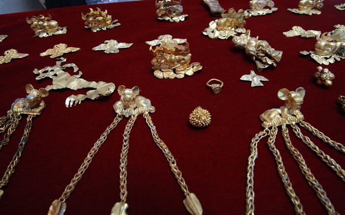Общее количество золотых изделий – 830 единиц. По датирующим признакам, большой курган, у подножья которого был найден золотой клад, относится к среднесакскому времени – к V- IV вв до н.э., т.е. артефакты 2500-2400 лет давности. По технологии изготовления, материалам, формам и сюжетам золотые украшения предварительно также датируются V- IV вв. до н.э. и являются особо ценными памятниками искусства саков Алтая-Тарбагатая.