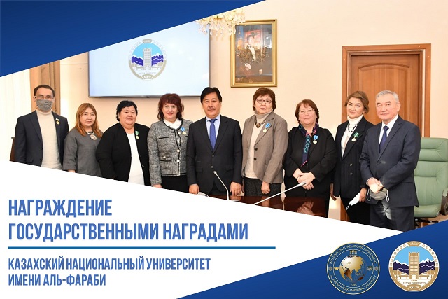 В торжественной обстановке, в зале приемов КазНУ имени аль-Фараби, ректор Галимкаир Мутанович Мутанов от имени Президента Республики Казахстан Касым-Жомарта Токаева вручил высокие государственные награды «Ерен еңбегі үшін» и медаль «Шапағат» преподавателям и сотрудникам университета.