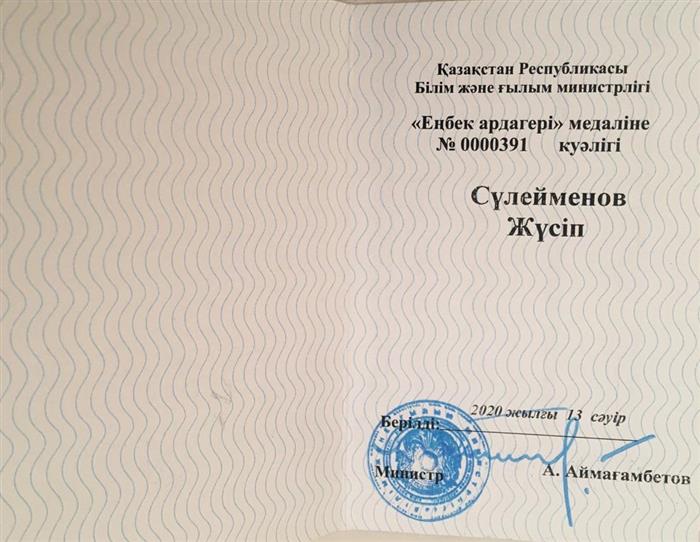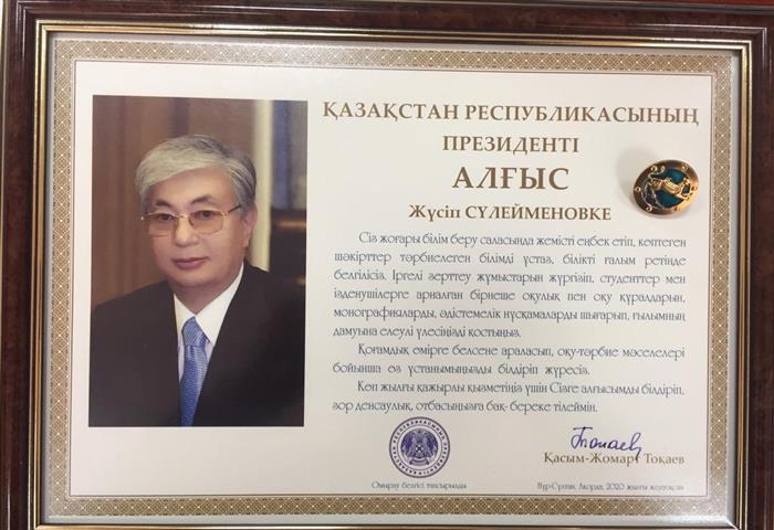 В этом году Жусип Сулейменовичу Сулейменову исполнилось 80 лет. Госсекретарь РК Крымбек Кушербаев поздравил профессора Ж.С. Сулейменова с юбилеем и от имени Президента РК К.К.Токаева вручил ему благодарственное письмо и нагрудный почетный знак «Алтын барыс».