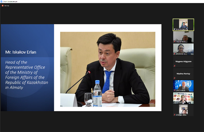 Глава представительства МИД РК в г. Алматы г-н Е.У. Искаков, поздравив присутствующих с важной датой, подробно остановился на стратегических инициативах и программах по укреплению деятельности ООН в РК и имплементации Целей Устойчивого развития.