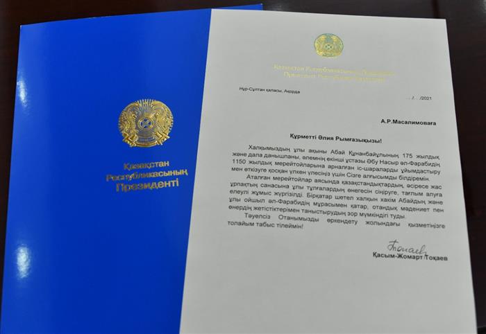 Председатель правления-ректор Казахского национального университета имени аль-Фараби Ж. К. Туймебаев в преддверии Дня науки опубликовал благодарственное письмо Президента Республики Казахстан Касым-Жомарта Кемелевича Токаева за вклад в организацию и проведение мероприятий, посвященных 175-летию со дня рождения великого поэта Абая Кунанбаева и гения степи, второго учителя мира Абу Насра аль-Фараби. Благодарность Президента получили профессора и сотрудники университета: Мехмет Арслан, Шолпан Джаманбалаева, Жакыпбек Алтаев, Жангара Дадебаев, Айжан Смайлова, Бекжан Мейрбаев, Калима Туенбаева, Акмарал Сыргакбаева, Ыктияр Палторе, Алия Масалимова, Айнур Курманалиева, Даурен Мухамеджанов, Даурен Дюсебаев, Наталья Сейдахметова.