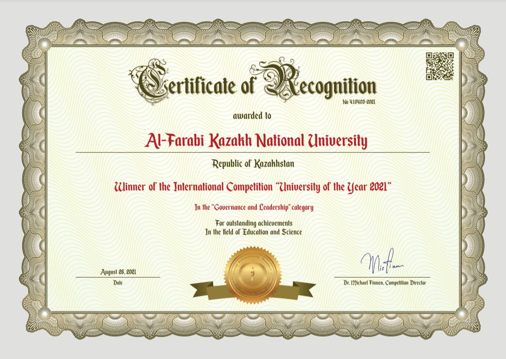По итогам международного конкурса «Университет года – 2021», проводимого Канадским комитетом по исследованию международных достижений и региональным центром Восточной Европы и Азии (International Achievements Research Center), победителем признан КазНУ им.Аль-Фараби. В письме директора конкурса, доктора Майкла Финнена отмечено, что университет получил международный сертификат в номинации «Управление и лидерство» за выдающиеся достижения в образовании и науке.