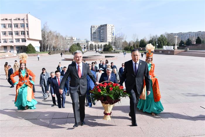 Масштабное мероприятие началось с возложения цветов к памятнику великому учителю. Участие в церемонии приняли: Председатель Правления –Ректор КазНУ им.Аль-Фараби Жансеит Туймебаев, генеральный консул Республики Узбекистан в Алматы Аброр Фатхуллаев, известные ученые – фарабиеведы, представители этнокультурных центров.