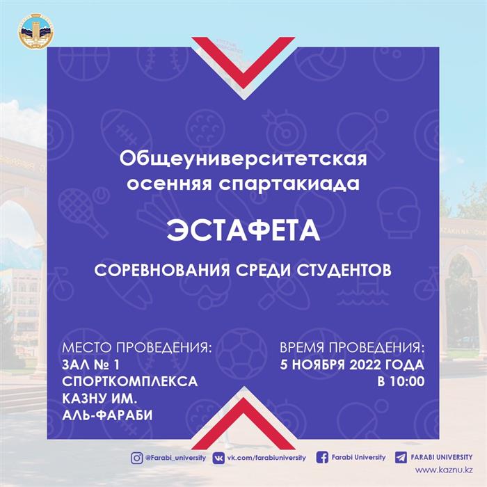 Сообщаем, что в КазНУ им. аль-Фараби пройдет эстафета среди студентов, организованная в рамках осенней спартакиады.