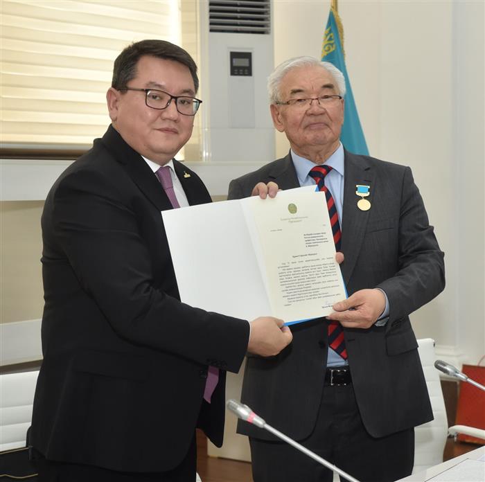 Также юбиляру были вручены поздравительные письма Государственного советника Ерлана Карина, заместителя Руководителя Администрации Президента РК Аиды Балаевой, Министра науки и высшего образования РК Саясата Нурбека, Министра информации и общественного развития РК Дархана Кыдырали.