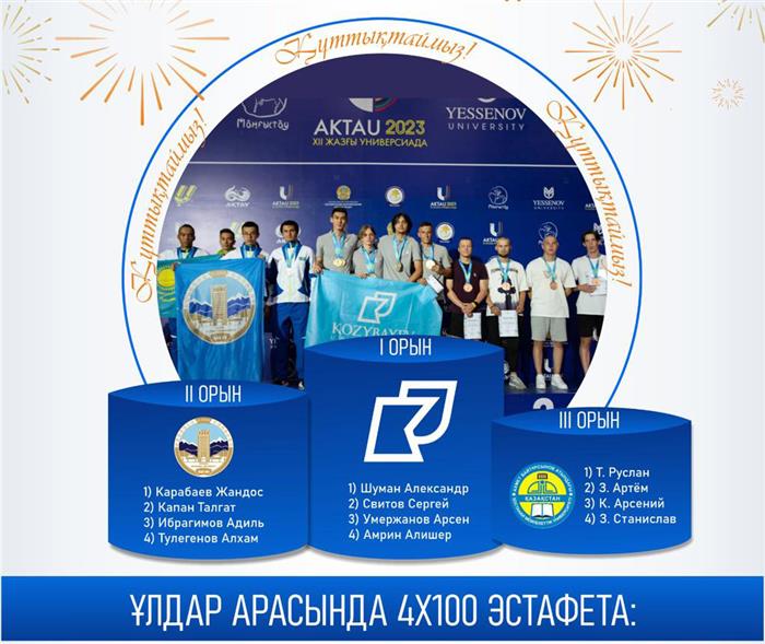 На XII летней Универсиаде завершились состязания по легкой атлетике среди женщин и мужчин. Сборные команды Казахского национального университета имени аль-Фараби вновь отличились и добились победы. По итогам соревнований студентка КазНУ Кем Эрика заняла первое место по толканию ядра среди женщин. А в эстафете 4х100 среди юношей команда КазНУ заняла второе место. В составе команды соревновались Жандос Карабаев, Капан Талгат, Ибрагимов Адиль и Тулегенов Алхам.