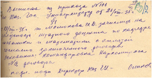 Выписка из приказа директора КазГУ о зачислении с 19 августа 1935 года И.Д.Молюкова штатным доцентом кафедры механики и математики.