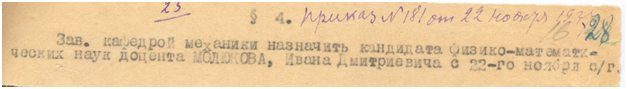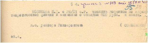 Выписка из приказа о зачислении с 24 ноября 1941 года И.Д.Молюкова доцентом кафедры теоретической физики и механики.