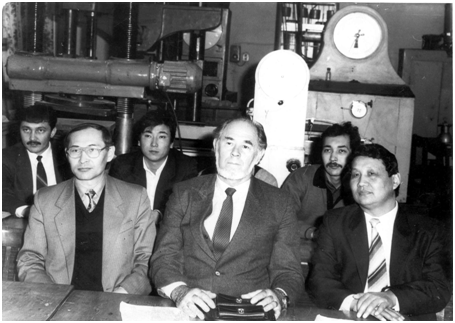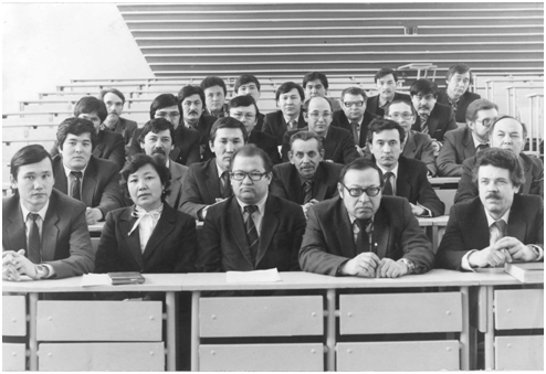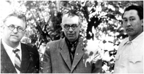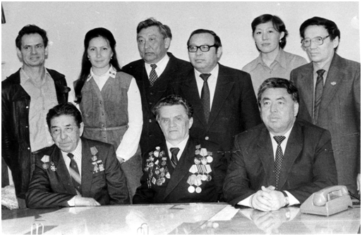 Стоят слева направо: Г.У.Уалиев, У.А.Джолдасбеков, Е.Р.Рахимов.