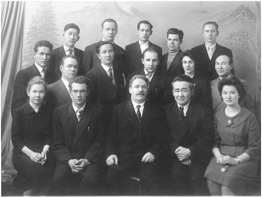 Б.П.Устименко, Ш.А.Ершин, И.Б.Палатник и др. В третьем ряду слева направо: Х.Жургенбаев, Ж.Сакипов и др. Начало 60-х годов.