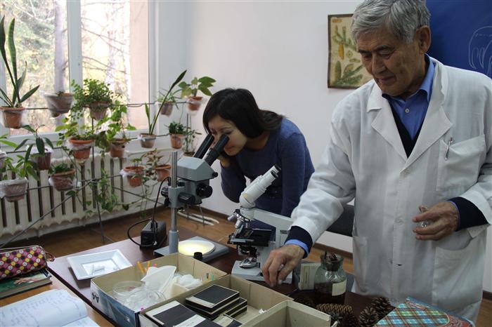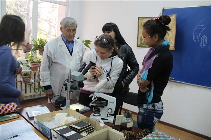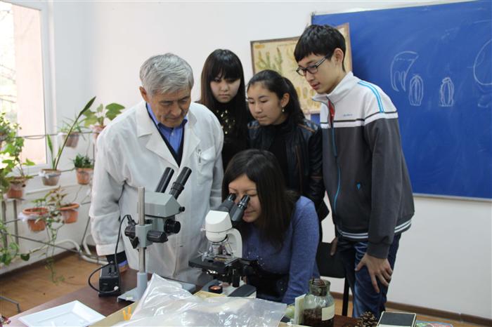 Взаимное совместное содружество Республиканского научного практического центра «ДАРЫН» с кафедрой биоразнообразия и биоресурсов КАЗНУ им. аль-Фараби по повышению уровня знаний школьников Алматинской области. На слайде, в момент занятия по ботанике с и.о. профессора Бегеновым А.Б.