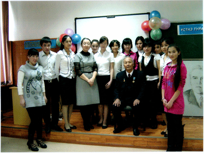 3 декабря 2011 года в 10 часов в 221 аудитории химического факультета был проведен открытый кураторский час на тему «Воспоминание о великом учителе», посвященное столетию со дня рождения члена – корреспондента АН КазССР, заслуженного деятеля науки КазССР, доктора химических наук, профессора Батырбека Ахметовича Беремжанова, с участием его первого аспиранта - доктора химических наук, профессора Н.Н.Нурахметова. Кураторский час был организован к.х.н. старшим преподавателем Н.С. Далабаевой и студентами 2-курса специальности «Химия» и был посвящен жизнедеятельности и трудовым достижениям профессора Б.А. Беремжанова. Исполнено песня и в конце кураторского часа прочитан студентом 205 группы А.Еламановой стихотворение посвященное великому учителю. |