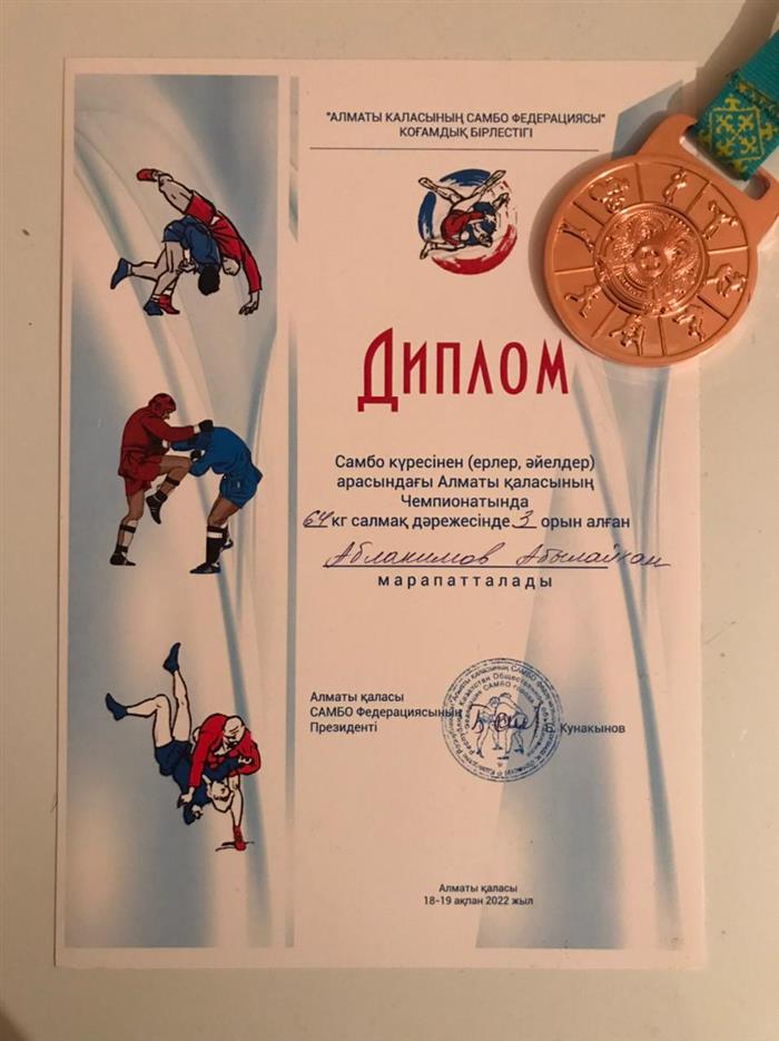 Студент 3 курса 301 группы Аблакимов Абылайхан Диплом 3 степени Чемпионат Алматы по Самбо эдвайзер Урисбаева А.А. |