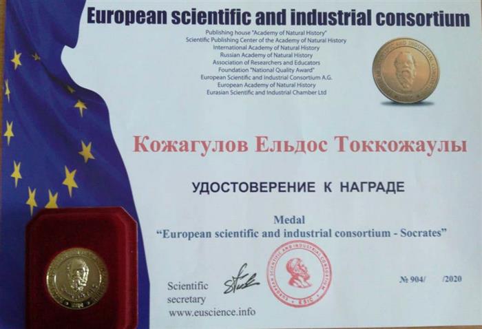 | Кожагулов Е.Т. и Исмаилов Д.В. были награждены дипломами I степени, а также Медалями «Сократа» и «Исаака Ньютона» за руководство и подготовку юных исследователей к VIII Международному конкурсу научно-исследовательских и творческих работ учащихся «Старт в науке», который был проведен в МГУ, Российской Академии Естествознания | ![]() |