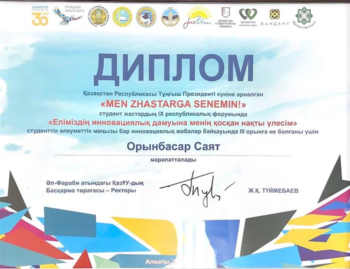 | «МЕН ЖАСТАРҒА СЕНЕМІН!» Посвящается Дню Первого Президента Республики Казахстан. Орынбасар Саят был удостоен третьего места в конкурсе инновационных студенческих общественно значимых проектов «Мой реальный вклад в инновационное развитие страны» на IX Республиканском форуме студенческой молодежи. |