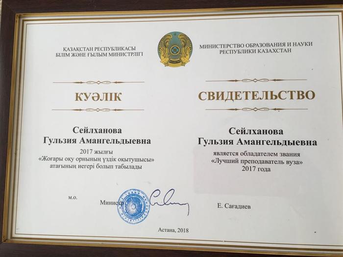Профессор Г.А. Сейлханова награждена свидетельством за Лучшего преподавателя вуза 2017 года. |