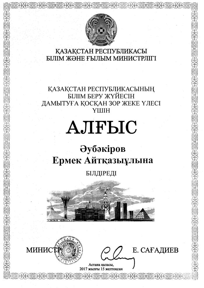 Аубакиров Ермек Айтказыулы был награжден Благодарственной Грамотой министром образования и науки РК за выдающийся личный вклад в развитие системы образования Республики Казахстан! |